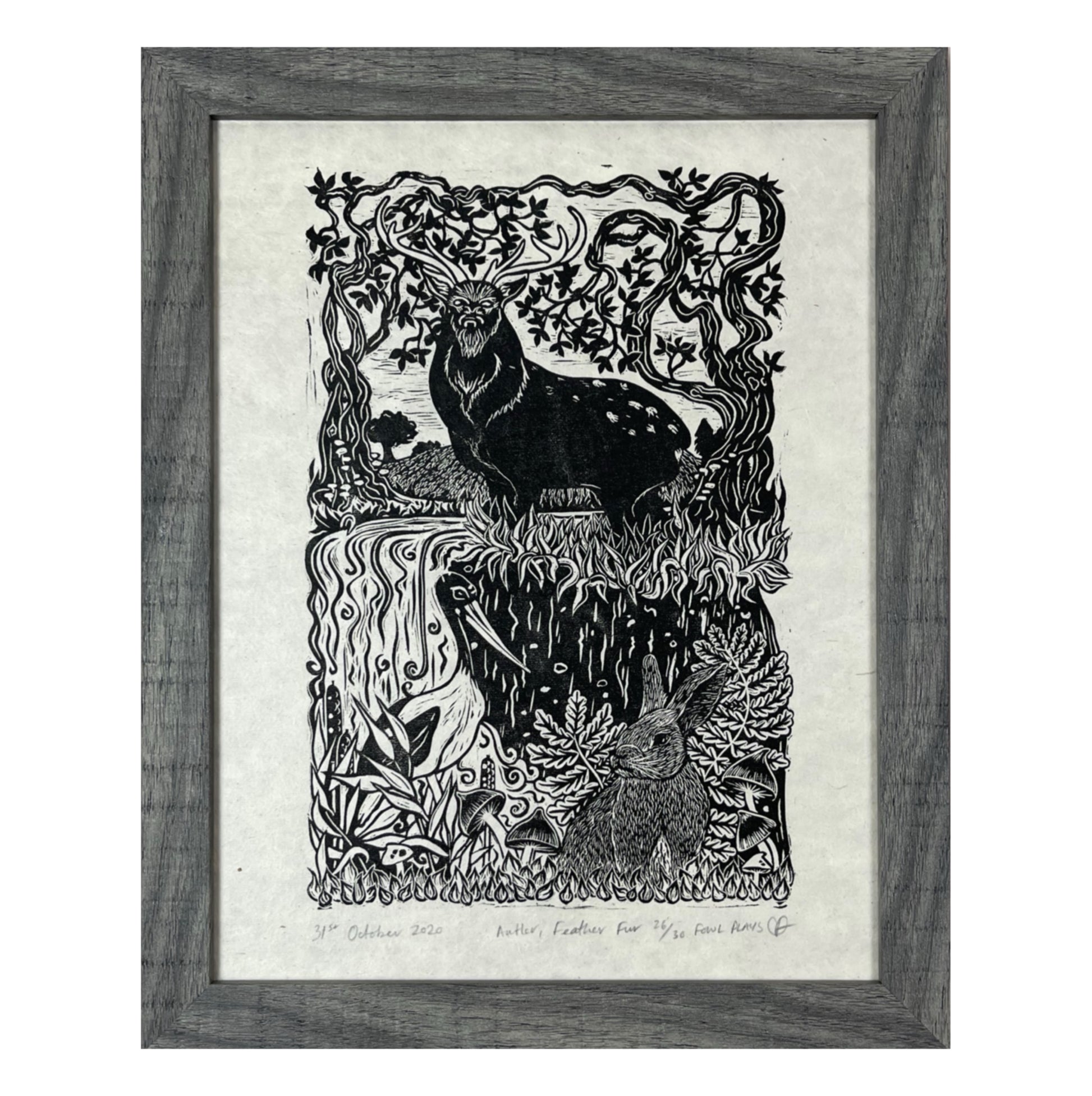 Bring the charm of the English countryside into your home with this beautifully detailed, limited-edition lino print. Hand-carved and printed using eco-friendly oil-based archival ink, this design showcases a majestic stag standing between two ancient trees on a cliffside beside a cascading waterfall. A curious stork watches near the falls, while a rabbit rests amid mushrooms and ferns, creating a rich tapestry of English flora and fauna.